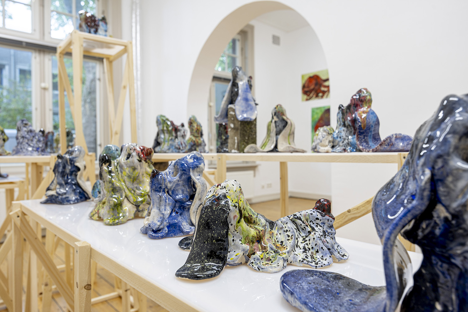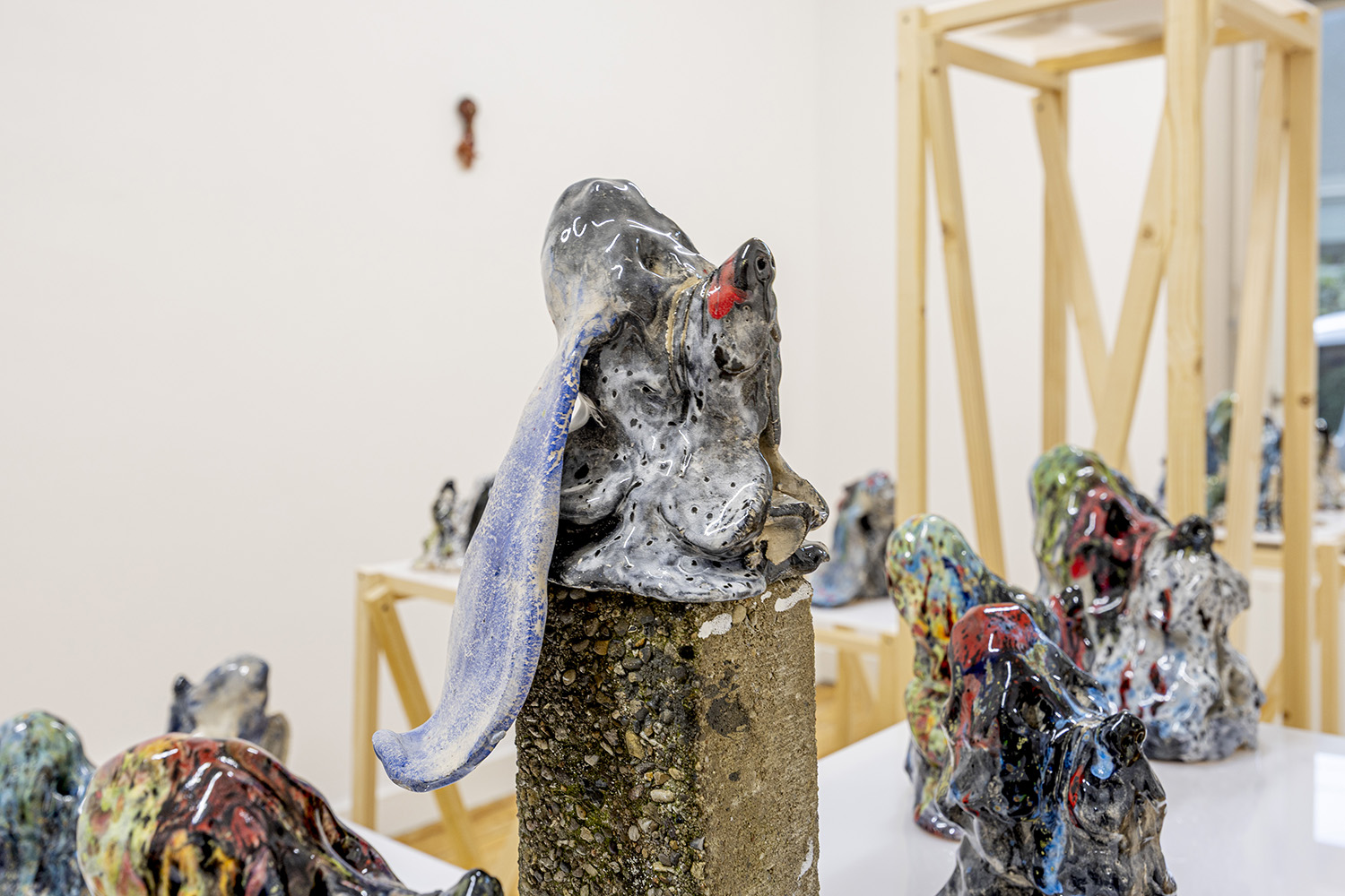 In Schrikkers solotentoonstelling Crooked Teeth in an Octopus’ Garden ligt de nadruk op twee centrale lijnen uit zijn recente praktijk: aquarellen van octopussen en keramisch werk van hound-achtige hondenkoppen. De serie van bijna 30 koppen, geïnspireerd op rassen als de Basset hound en Bloodhound, is nu voor het eerst in zijn geheel te zien bij Ruby Soho.